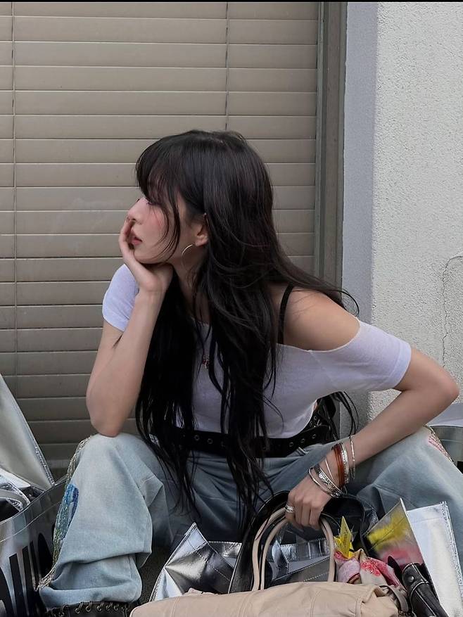 이채영은 한쪽 어깨가 자연스럽게 드러나는 화이트 원숄더 티셔츠로 건강한 섹시미를 연출했고, 하이웨이스트 와이드 데님 팬츠로 레트로한 실루엣을 더했다. 여기에 펑키한 스터드 벨트와 볼드한 뱅글을 더해 개성 넘치는 스타일링을 완성했다. 특히 주렁주렁한 쇼핑백들과 반짝이는 실버 토트백은 마치 패션위크 스트리트컷을 연상케 할 정도로 강렬한 존재감을 뽐낸다.