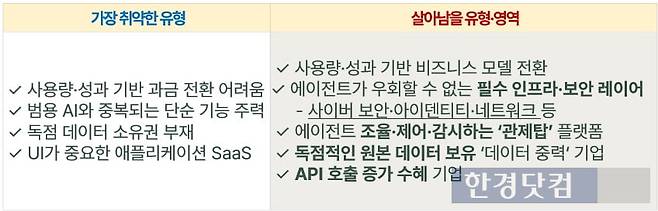 이런 변화에 가장 취약한 기업은 명확합니다. △사용자 수 과금 체계에 대한 매출 의존도가 높거나, 성과·사용량 기반 과금 체계로 전환하기 어려운 기업 △단순 번역, 디자인, 코딩처럼 범용 AI가 쉽게 대체할 수 있는 기능을 주력으로 하는 기업 △독점적인 원본 데이터 없이 공개된 API를 연결해 편리한 UI를 얹어 제공하는 애플리케이션 SaaS 기업 등입니다.