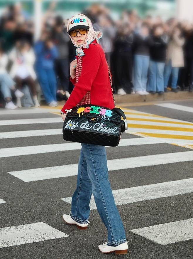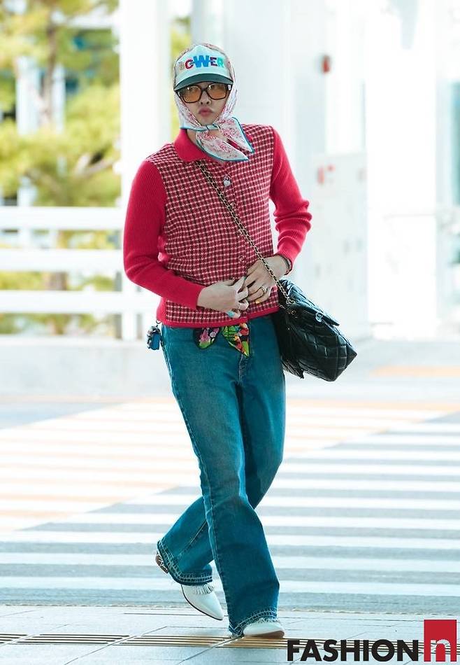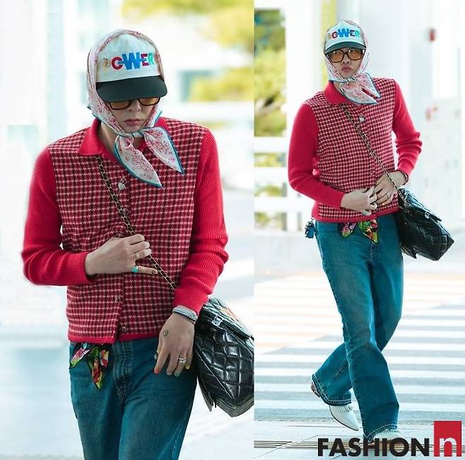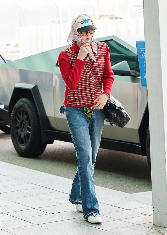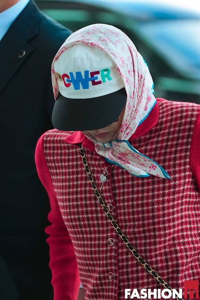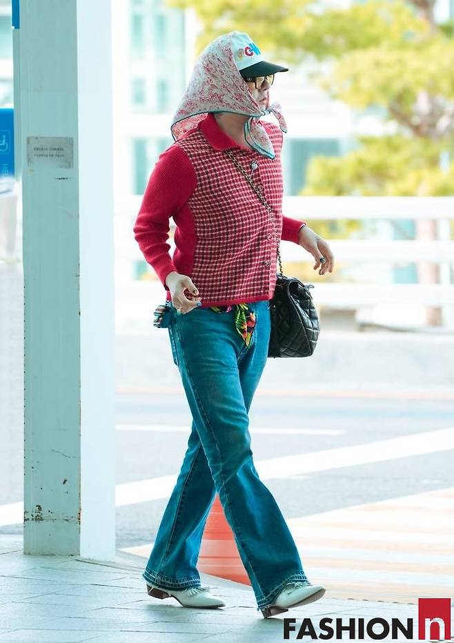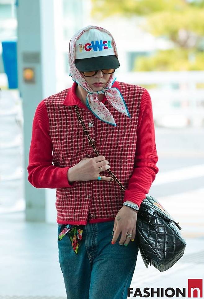 이날 지드래곤은 레드 스트라이프 패턴의 카디건과 볼캡, 여기에 헤드 스카프를 더한 그래니 시크룩으로 패션 감각을 뽐냈다.