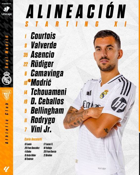 레알은 4-3-1-2 포메이션을 선택했다. 티보 쿠르투아가 골문을 지켰고, 페데리코 발베르데, 라울 아센시오, 안토니오 뤼디거, 에두아르도 카마빙가가 백4를 구성했다. 루카 모드리치, 오렐리앙 추아메니, 다니 세바요스가 3선을, 주드 벨링엄이 2선을 담당했다. 호드리구와 비니시우스 주니오르가 투톱을 이뤘다.