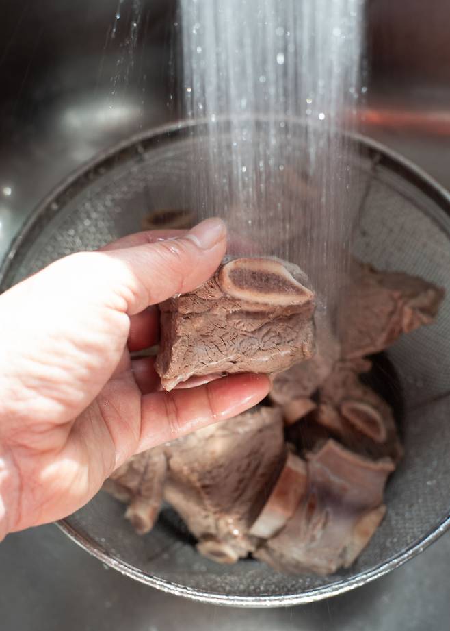 1. 소갈비는 끓는 물에 10분 정도 데쳐 불순물을 제거한 후 찬물에 헹군다.