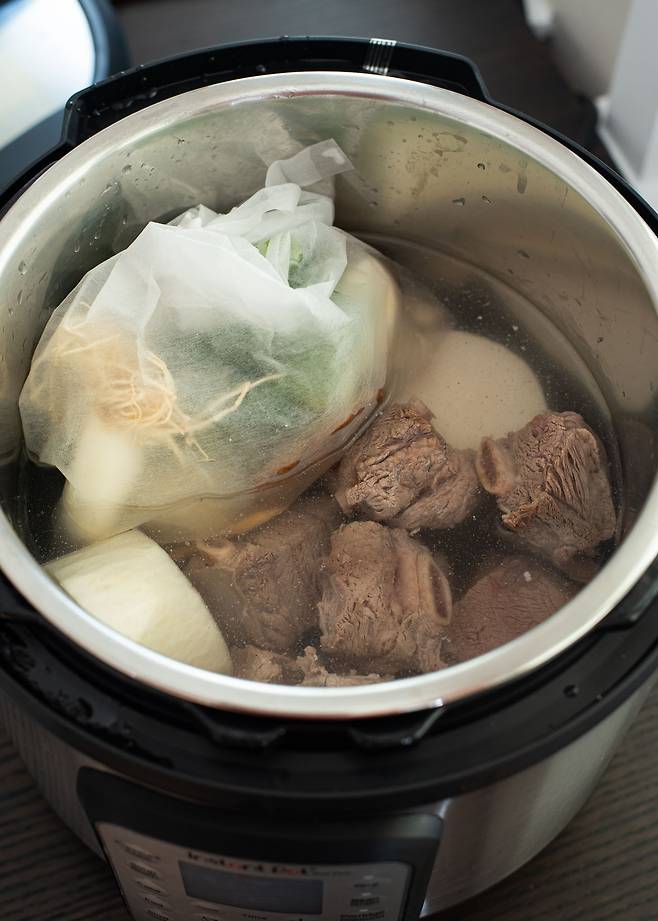 2. 큰 냄비에 갈비, 무, 양파, 대파, 마늘, 표고버섯을 넣고 물을 넉넉히 부어 1시간 이상 중불에서 끓인다. 다시마는 끓기 시작한 후 5분만 넣고 건져낸다.
