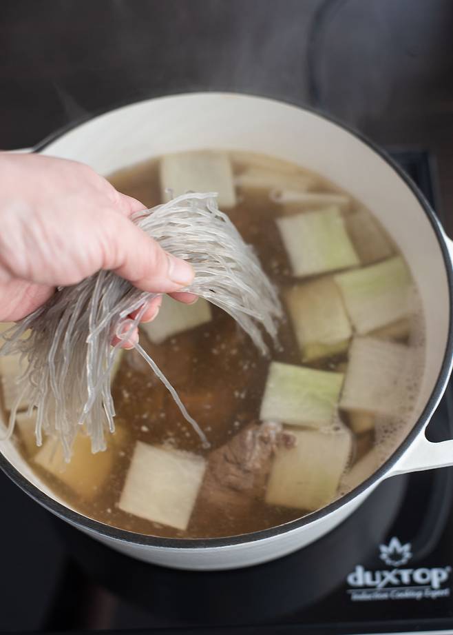4. 불린 당면을 넣어 2분간 끓이고, 대파 송송 썬 것을 올려 마무리한다.