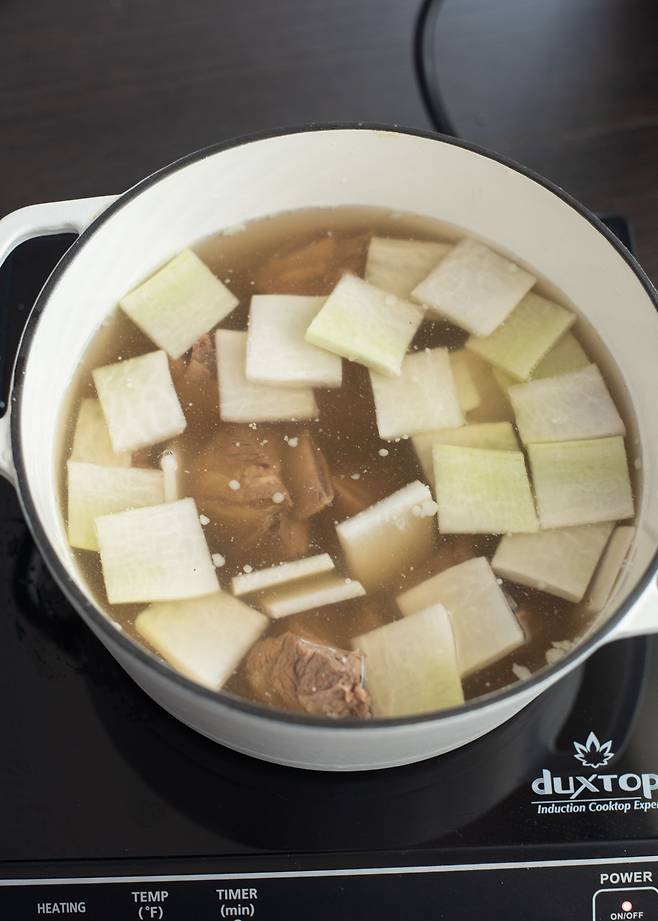 3. 국물이 우러나면 건더기를 건져내고, 갈비와 무만 남긴다. 국간장, 소금, 후추로 간을 맞춘다.