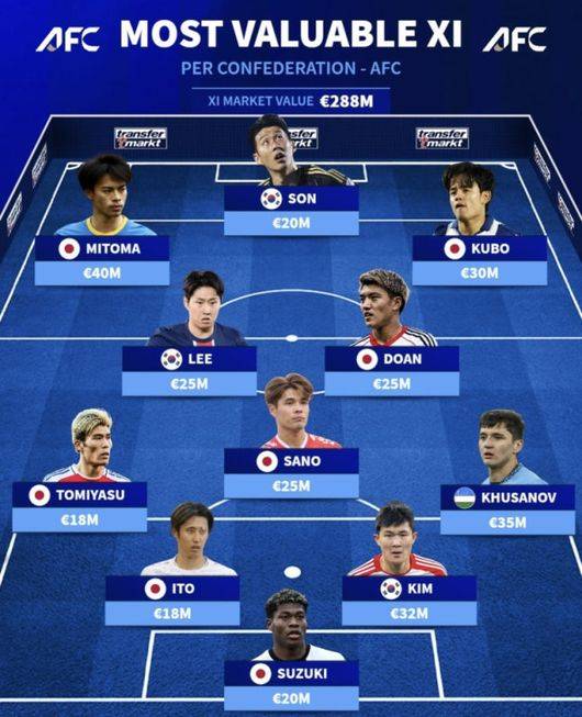 한국 축구의 현재이자 미래인 이강인이 2500만 유로(약 415억 원)로 중원의 한 자리를 차지했다. 한국 대표팀 주장 손흥민은 2000만 유로의 시장가치를 기록하며 최전방에 자리했다.