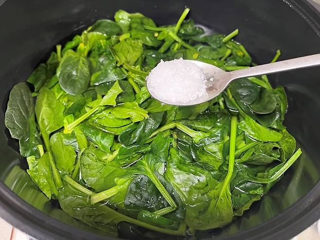 시금치를 데칠 때 소금을 약간 넣어 보세요! 소금은 시금치의 선명한 초록색을 유지해 주고 떫은맛을 줄여줍니다.