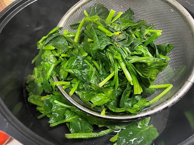 물이 팔팔 끓을 때 시금치를 넣고 1분 내외로 데칩니다. 시금치는 조직이 연해 오래 데치면 금세 물러지고 영양소가 손실될 수 있습니다.