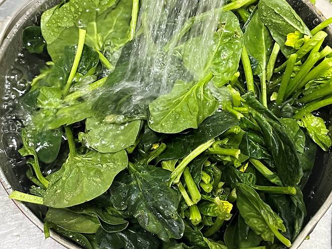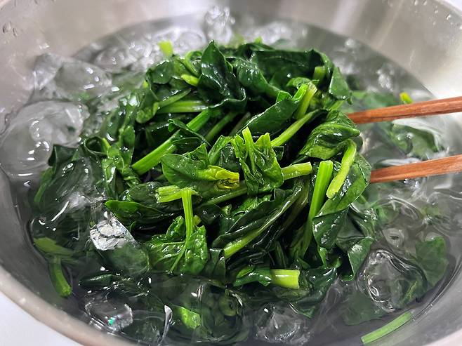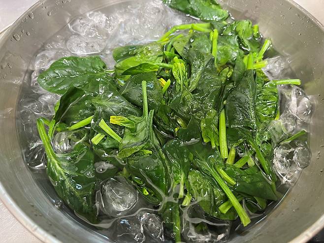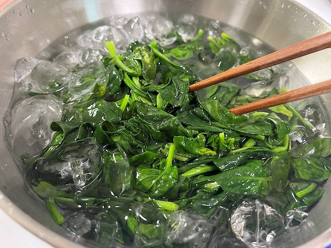 시금치를 데친 뒤 찬물도 좋지만, 얼음물에 헹궈 보세요. 이렇게 하면 열감이 빠지면서 아삭하고 탄탄한 식감을 즐길 수 있습니다.