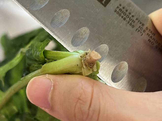 시금치의 뿌리 끝부분은 잘라내고 마르거나 누렇게 변한 잎들을 제거합니다.