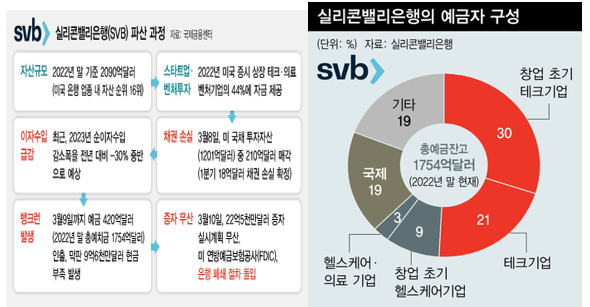 미국 연준이 2022년 2월 0.25%에서 2023년 2월 4.75%까지 기준금리를 4.5%p 인상하자 SVB가 보유한 유가증권 가치가 크게 하락했다. 또 IT산업 호황이 끝나면서 실리콘밸리 IT기업들의 예금이 큰 폭으로 인출됨에 따라 SVB는 유가증권을 대량으로 매각할 수밖에 없게 됐다. 이에 따라 만기보유증권의 미실현 손실은 170억달러에 달했고 매도가능증권 매각으로 18억 달러의 손실이 발생한 것이다.(주- 자산의 절반 이상을 차지하는 유가증권의 경우 매도가능증권(260억 달러)과 만기보유증권(913억 달러), 그리고 비시장성증권(27억 달러)으로 구성됐다. 매도가능증권은 시장가격으로 평가하여 금리가 급격하게 상승하면 자산가치가 바로 재무상태표에 표기되지만 만기보유증권은 매입가격으로 평가하기 때문에 금리 상승에 따른 평가손이 재무상태표에 반영되지 않는다. 그러나 급격한 인출 수요가 있을 때에는 이것을 매각해야 하고 손실이 그대로 드러나는 것이다. 시장에서 이것에 주목하고 SVB의 예금지급이 정상적으로 이루어지지 않을 것이라고 본 것이다.)