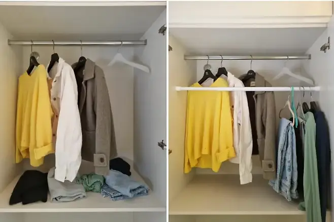 칸이 넓거나 폭이 깊은 옷장은 이렇게 2단으로도 활용해 보세요. 길이가 짧은 옷들은 행거에 옷을 걸고 나면 하부 공간이 텅 비어서 아깝잖아요? 꺼내 입을 옷 찾기도 훨씬 편하고, 구겨질 일도 없어요. (단, 옷이 너무 많으신 분은 차곡차곡 개서 서랍장을 아래에 두시는 게 더 깔끔해 보일 것 같네요)
