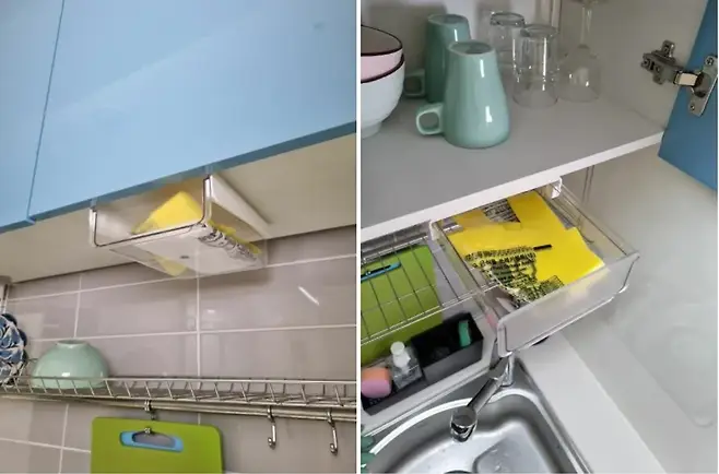 요리할 때 그리고 싱크대 쌓인 음식물 처리할 때, 가장 필요한 음식물 쓰레기 봉투! 찬장 안이나 서랍에 넣어두면 꺼내기도 어렵고, 얼마나 남았는지 확인이 안 될 때가 많더라고요. ‘편의점 갈 때 봉투 사와야지’ 하면서도 까먹어버리는 게 일상이죠. 그래서 눈에 가장 잘 보여서 찾기 쉬운 곳에 부착해줬답니다. 별 거 아닌 거 같아도 꽤 유용하게 공간 활용을 할 수 있어서 좋아요.