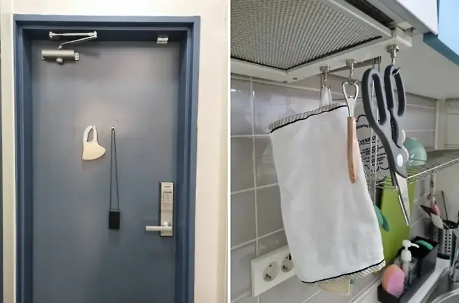 현관문에는 특히 쉽게 잊어버리는 물건들을 걸어두면, 외출할 때마다 ‘아차’ 하면서 다시 집안으로 들어갈 일이 없어져요. 주로 우산이나 모자, 마스크, 차키 같은 걸 걸어두면 좋겠죠?
