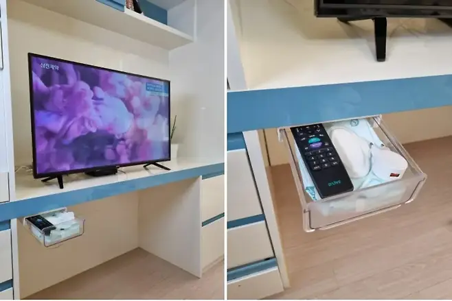 책상 서랍 아래에도 붙여줬어요. 주로 많이 쓰는 것들 위주로 쏙 넣어주면 되는데요. 책상 위가 지저분해지지 않아서 너무 좋더라고요. 먼지 쌓이거나 닦아낼 필요도 없고, 필요할 때만 꺼내 쓰면 되니까요.