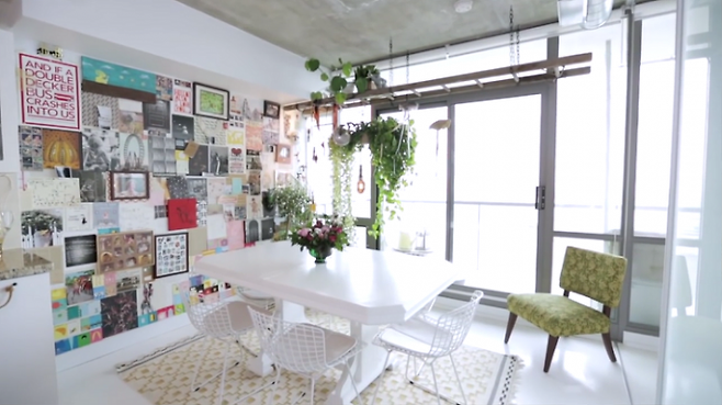 다양한 액자와 화분을 이용해 다이닝 공간을 꾸며 이 콘도가 여성이 사는 공간임을 알려주고 있다. 사진과 편지, 다양한 액자를 활용해 벽 한쪽을 꾸미면서 로컬 카페 같은 느낌을 연출했다. 사다리를 활용한 화분 거치대 또한 흥미롭다. 테이블은 버려진 것을 색을 다시 칠해 재활용한 것이다.