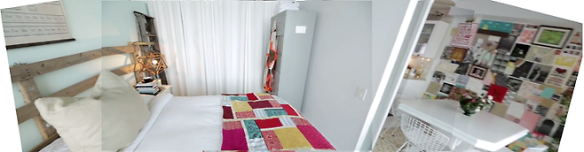 옷장은 커튼을 사용해 가려 작은 침실을 좀 더 깔끔하게 만들었다. 침대 헤드보드는 버리진 팔레트를 재활용한 것으로 국내에서도 시도해 볼 수 있는 쉬운 방법이다.
