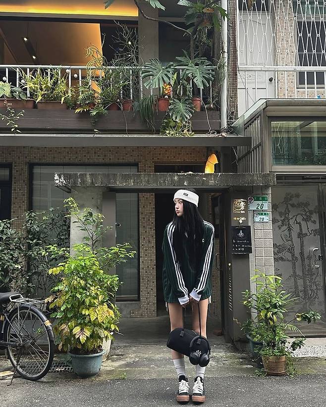공개된 사진 속 하늘은 짙은 그린 컬러의 스트라이프 트레이닝 저지를 활용해 캐주얼하면서도 스포티한 분위기를 자아냈다. 상의는 V넥 라인이 더해진 오버핏 디자인으로, 편안한 실루엣이 강조되었다. 특히 어깨부터 소매까지 이어지는 클래식한 화이트 라인의 디테일이 레트로 감성을 더한다.