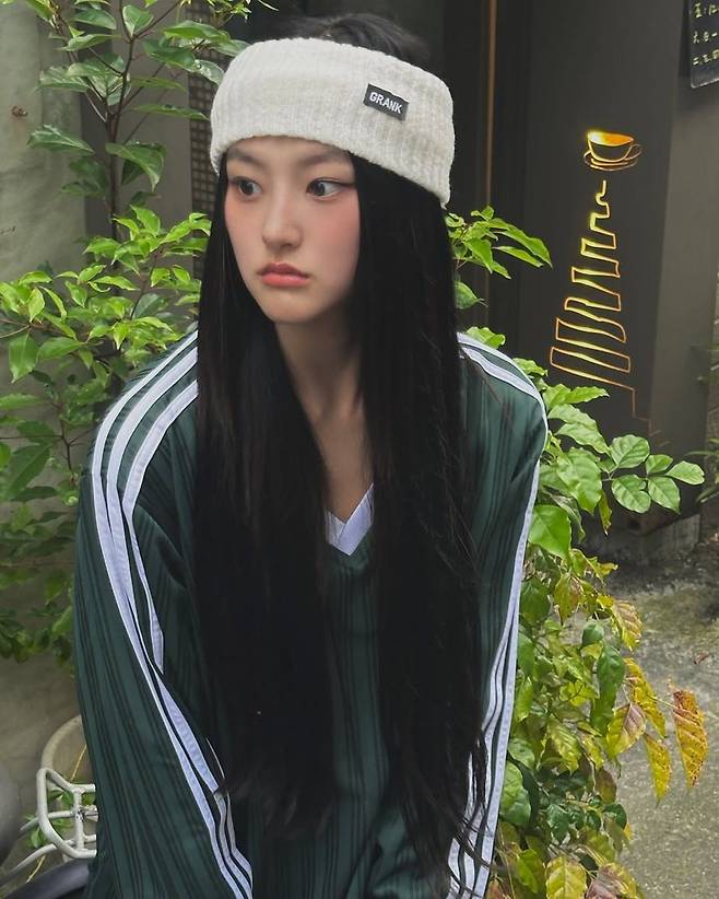 헤어스타일은 자연스럽게 풀어내린 롱스트레이트 헤어로, 빈티지한 분위기를 배가시키며 얼굴을 더욱 돋보이게 했다. 여기에 GRANK 로고가 새겨진 화이트 니트 헤어밴드를 더해 스타일 포인트를 살렸다. 헤어밴드는 단순한 액세서리 이상의 역할을 하며 복고적인 감성과 스포츠웨어 무드를 동시에 표현한 요소로 작용했다.
