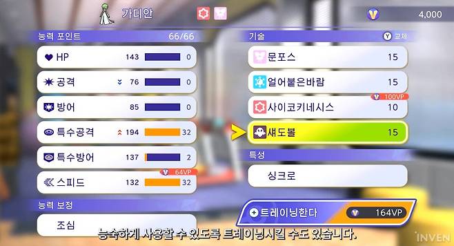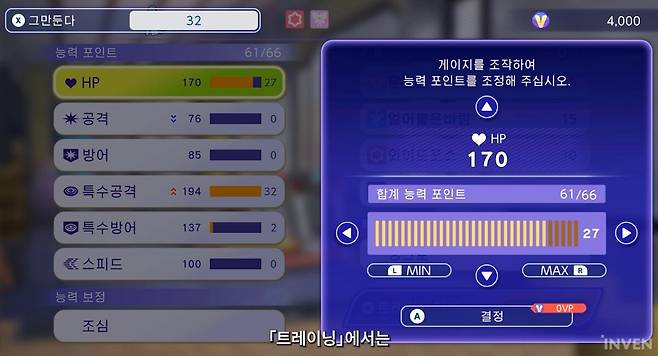포켓몬의 육성도 게임 안에서 가능하다. 트레이닝 메뉴에서는 능력 포인트가 허용하는 한도 내에서 HP, 공격, 방어, 특수공격, 특수방어, 스피드 등 6가지 능력에 자유롭게 포인트를 배분할 수 있다. 또한, 기술 역시 능숙하게 사용할 수 있도록 트레이닝할 수 있다. 특성, 능력 보정 역시 수정 가능한 모습을 영상에서 확인할 수 있다. 단, 이러한 트레이닝에는 상황에 따라 게임 내 재화가 사용됨을 알 수 있다.