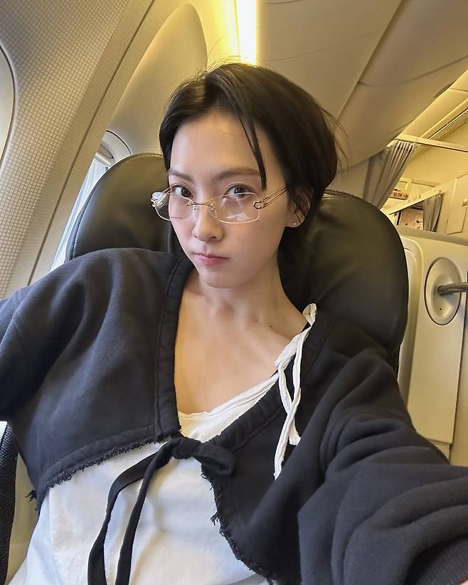 강지영은 얇은 골드 프레임의 투명 안경으로 스타일 포인트를 주며, 넉넉한 후디와 루즈한 화이트 슬리브 티셔츠를 레이어드해 무심한 듯 시크한 공항룩을 완성했다.