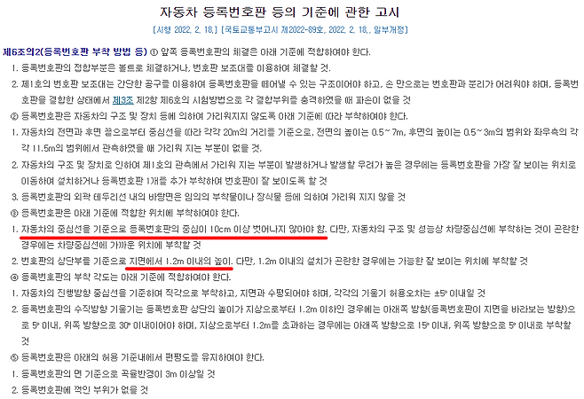 3항에 보면 구체적으로 위치가 안내되어 있는데 일단 차량 중심선 기준에서 번호판의 중심이 10cm 이상 벗어나지 않아야 하고, 지면에서 번호판 상단이 1.2m 이내에 위치해야 한다고 나와 있습니다.