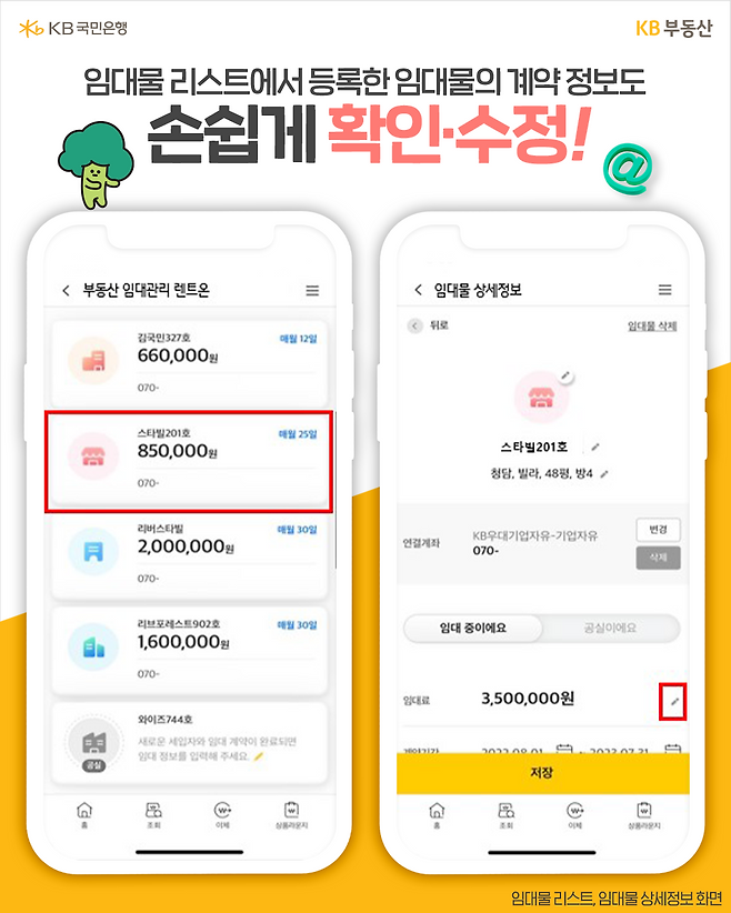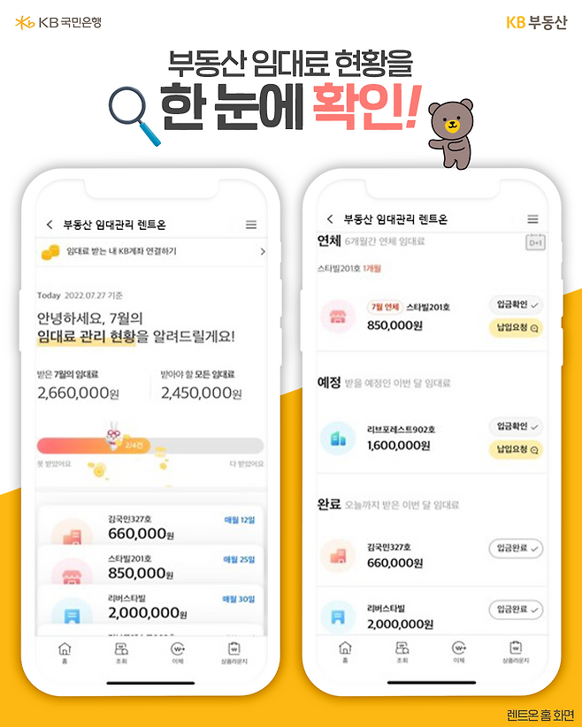 그런 분들을 위해 전문 업체처럼 알아서 임대료 일정 챙겨주고, 남들보다 더 빠르고 편하게 무료로 임대료 관리해 주는 ‘렌트온’을 소개합니다. KB국민은행에서 제공하는 부동산 임대관리 서비스 렌트온은 주택/상가/사무실 등 부동산을 임대 중이고, KB스타기업뱅킹을 이용하는 사업자라면 누구나 별도의 가입 절차 없이 사용 가능하며, 빠르고 쉽게 임대료 관리를 할 수 있습니다.