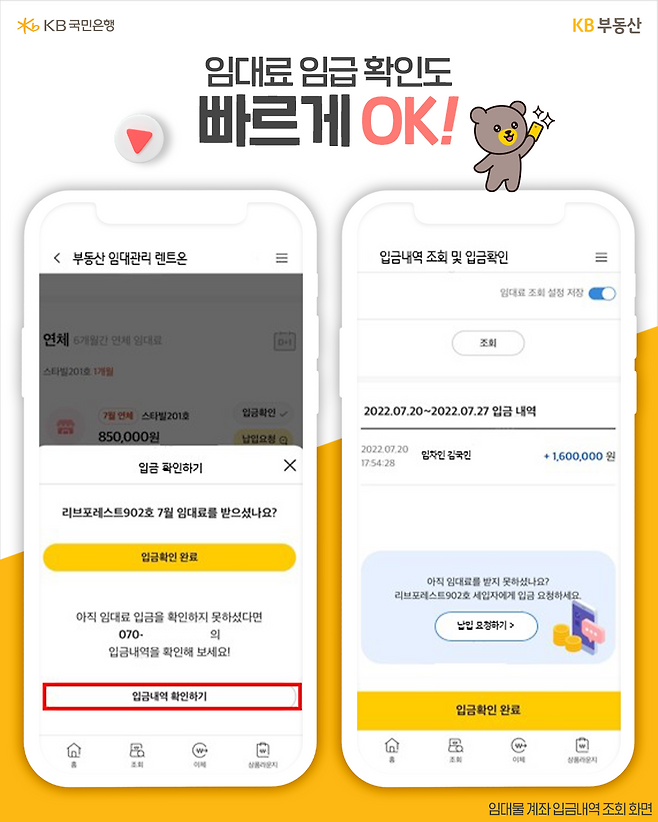 둘째, 렌트온 서비스 안에서 빠르게 임대료 입금확인을 할 수 있습니다.