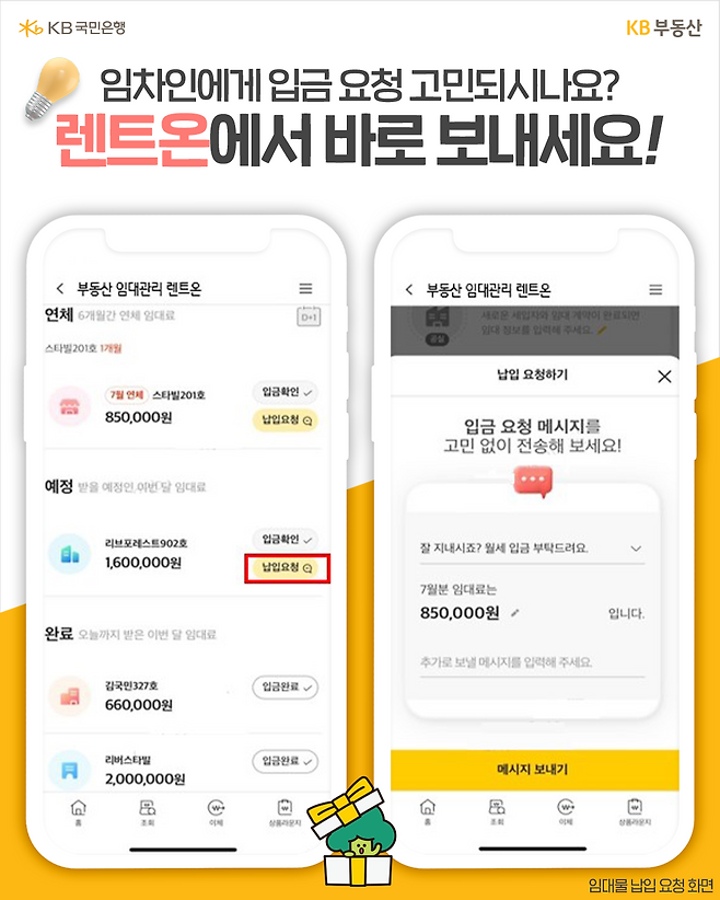 넷째, 고민 없이 임차인에게 임대료 납입 요청 메시지를 발송할 수 있습니다.