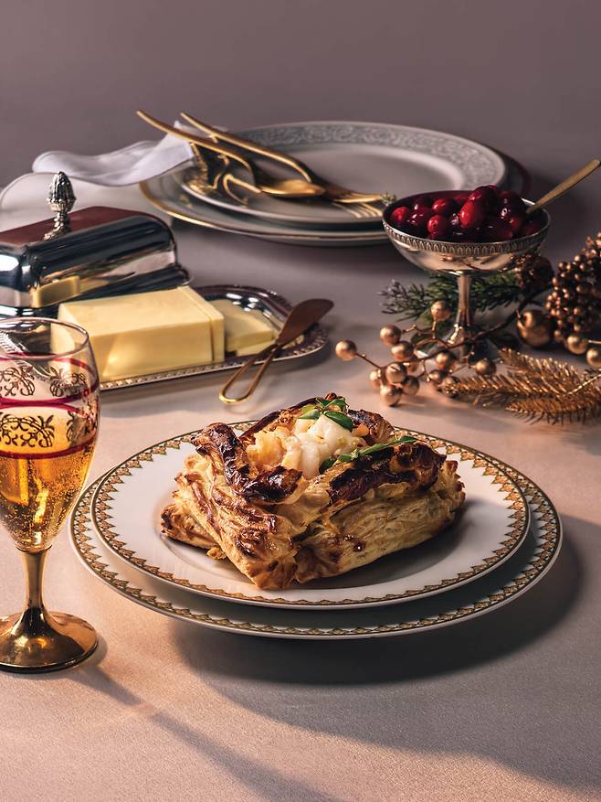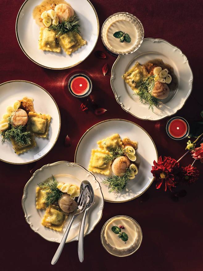 달콤하고 부드러운 대파와 탱글탱글한 관자의 식감이 조화로운 대파가리비관자구이를 작은 플레이트에 나눠 담고, 버터 소스로 고소함을 더한 라비올리 파스타를 곁들였다. 심플한 조리 방식을 통해 제철 재료 본연의 맛을 극대화한 메뉴로, 연말 파티 테이블에 잘 어울린다. 한 입 크기로 준비해 핑거 푸드로 즐기기에도 제격이다. 우유와 크림을 데워 위스키나 럼, 브랜디를 추가해 마시는 에그노그를 곁들이면 크리스마스 만찬으로 손색없다.