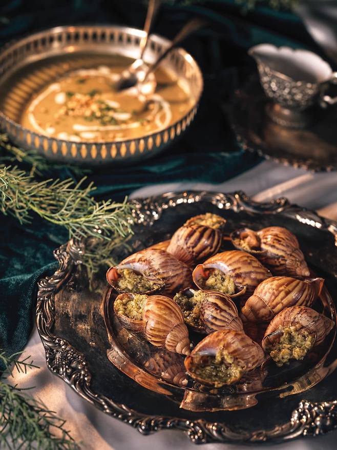 식용 달팽이에 마늘·파슬리·버터 등으로 만든 소스를 곁들인 뒤 오븐에 구워 완성하는 에스카르고는 프랑스의 고급 요리로 알려져 있다. 달팽이 요리는 고대 그리스∙로마 시대부터 귀족들이 별미로 즐겨 먹었는데, 프랑스에서는 19세기 초 셰프 앙토냉 카렘이 러시아 황제 알렉산드르 1세를 위한 만찬에서 마늘·허브·버터를 넣은 새로운 스타일을 선보이며 유명해졌다. 삶은 밤을 곱게 다져 만든 밤 수프를 매치하면 맛이 한층 배가된다.
