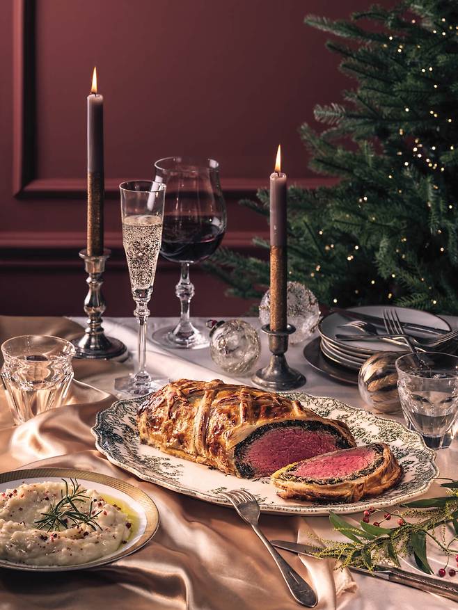 영국 전통 요리인 비프 웰링턴은 맛이 고급스러운 데다 양이 넉넉해 파티 요리로 각광받는 메뉴다. 부드럽게 익힌 소고기 안심에 머스터드소스를 바르고 시금치와 버섯을 다져 만든 뒤셀 소스로 감싼 다음 퍼프 페이스트리 반죽을 입혀 오븐에 굽는다. 페이스트리의 바삭한 식감과 육즙 가득한 고기의 풍미가 조화를 이룬다.