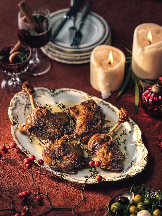 ‘콩피(confit)’는 프랑스어로 ‘보존하다’라는 뜻을 지닌 ‘콩피르(confire)’에서 비롯된 말로, 고기를 오랫동안 저장할 수 있도록 염지해 기름에 천천히 익히는 방식을 말한다. 이름에서 알 수 있듯, 오리 다리를 하루 동안 소금에 절인 뒤 오리 기름에 넣고 오랜 시간 익혀 만든 요리다. 고기 육즙과 향이 살아 있는 부드러운 속, 이와 상반된 바삭바삭한 껍질이 먹는 재미를 더한다. 리스 형태로 플레이팅한 올리브 플래터와 뱅쇼로 풍성한 식탁을 완성했다.