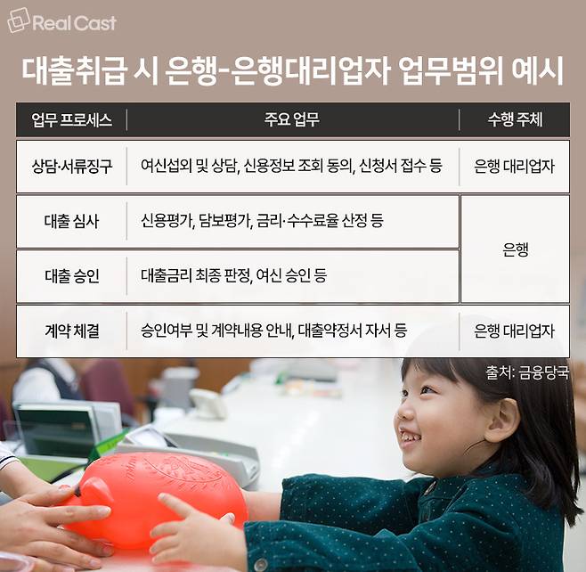 다만 은행대리업자는 은행의 모든 업무를 대신할 수 있는 것은 아니며 심사, 승인 등 의사결정이 필요한 업무는 은행이 직접 수행해야 합니다.