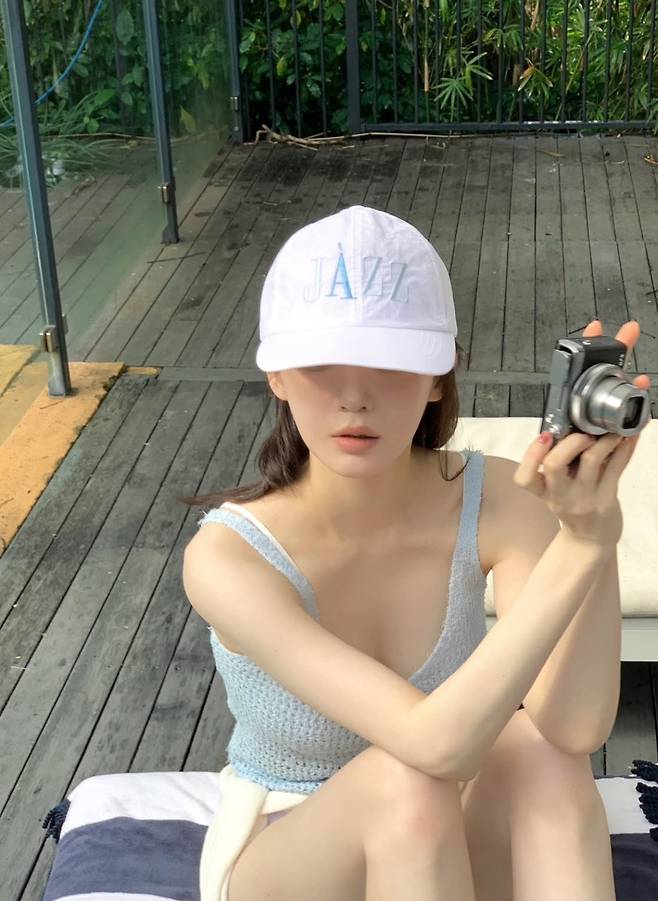 그녀는 하늘빛 니트 슬리브리스와 화이트 쇼츠를 조합해, 보기만 해도 시원한 꾸안꾸 스타일을 연출했다.