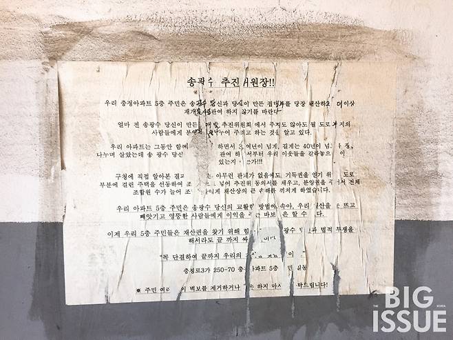 아마도 사람마다 다를 것이다. 모두가 관심을 두어야 하는 것도 아니다. 대부분의 사람이 ‘아파트’라는 주거 공간에 갖춰진 물질적 요소와 경제적 가치에 비중을 두고 있음을 과거 여러 사례를 통해 확인할 수 있다. 하지만 ‘개발’이라는 이슈가 수면 위로 떠오르게 되면 주거 공간을 중심으로 형성되어 있는 관계 요소를 파악하고 이해하는 과정도 필요하다. 물리적 환경이 직접적으로 변화하는 것 외에도 그 일대에 형성되어 있는 지역 생태계에 영향을 주기 때문이다. 골목으로 연결된 길, 충정아파트만큼이나 오래된 한옥과 상가 건물들, 그사이에 자라난 오래된 나무, 이곳을 자주 찾는 사람들 등. 동네와 관계를 맺고 있는 모든 요소에 변화가 찾아온다.