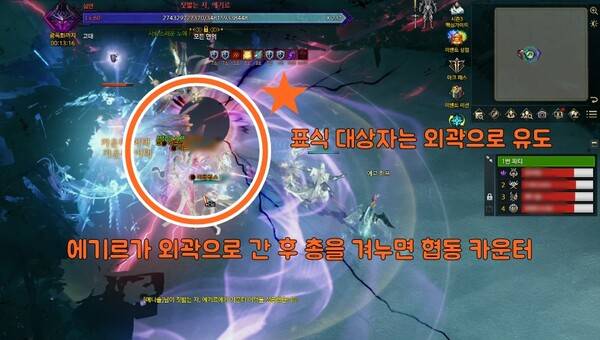 이후 풍차를 돌리며 어그로 대상자를 끌어 당긴다. 이 패턴에 괜히 딜하겠다고 무리하지 말고 최대한 외곽에서 에기르의 헤드 직선 방향을 피하자.