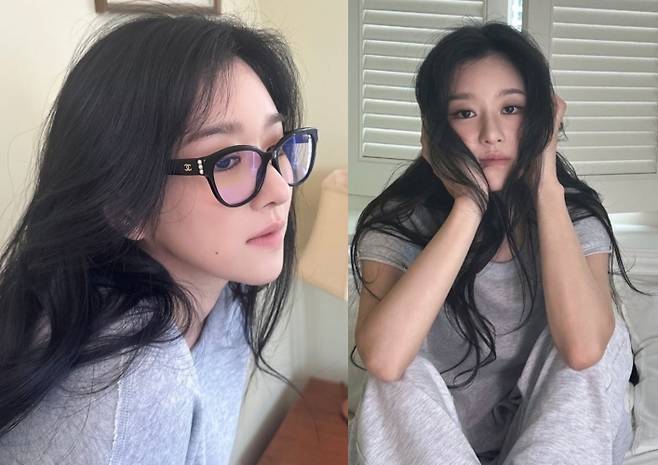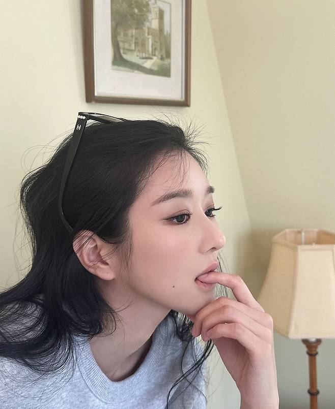 편안한 일상복 차림에 부드러운 웨이브가 말린 머리가 화려한 듯 자연스럽게 어우러지는 모습입니다.