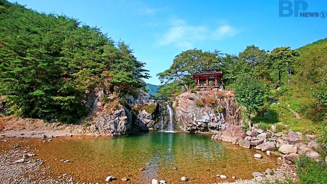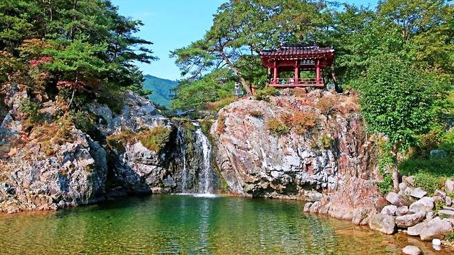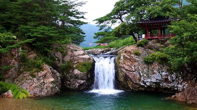 높은 절벽 아래로 시원하게 떨어지는 물줄기부터 주변을 감싸는 소나무 숲과 기암절벽, 계곡물 곁에 자리한 정자까지 자연과 사람이 조화를 이룬 고요한 풍경이 한여름 더위를 단숨에 씻어낸다.