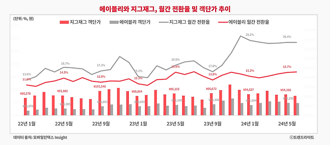 지그재그는 쇼핑몰 단위 선택 방식 덕분에 에이블리 대비 상대적으로 높은 전환율을 보이고 있습니다. 작년 11월 이후 대규모 고객 이탈에도, 핵심 고객은 그대로 유지되어 오히려 월간 전환율은 더욱 상승하였고요. 하지만 에이블리는 전 상품 무료 배송과 쿠폰 제공으로 가격 경쟁력을 높였지만, 상품 추천 기반 플랫폼이라서 그런지 전환율 자체는 낮았습니다.