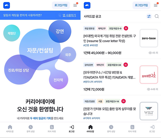 3년째 마케팅 기업을 운영 중인 30대 대표 신 모씨는 커리어데이 사이드잡 플랫폼을 통해 다양한 일감을 확보해왔다. 실제로 사이드잡 섹션에서 설문조사에 응하고 5000원을 받는 소액 일감부터 2~3개월짜리 UX(사용자경험) 프로젝트로 3000만원을 받는 일감까지 다양한 금액대의 부수입 프로젝트를 볼 수 있다.