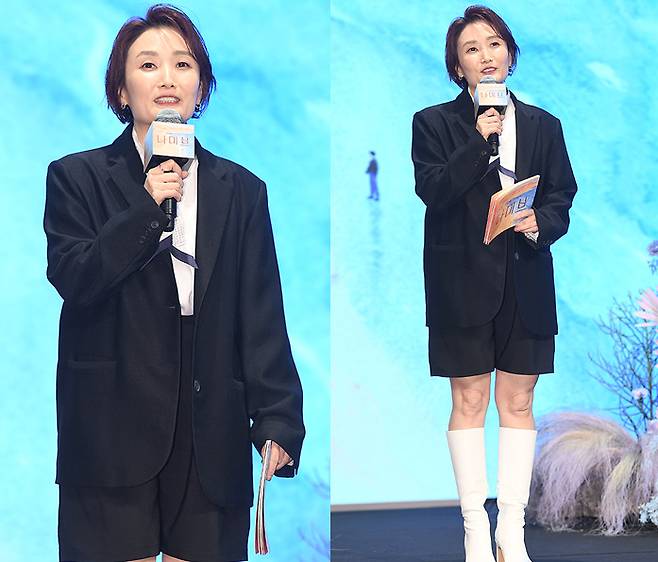 박경림은 박시한 오버핏 블랙 재킷과 쇼츠로 편안하면서도 깔끔한 분위기를 연출했습니다.