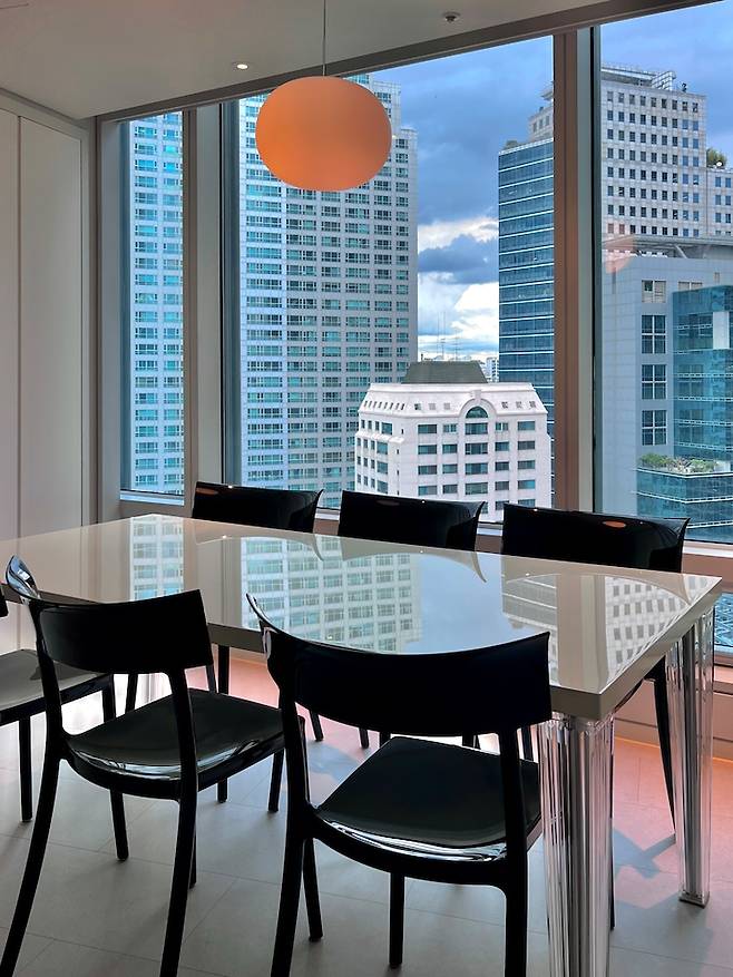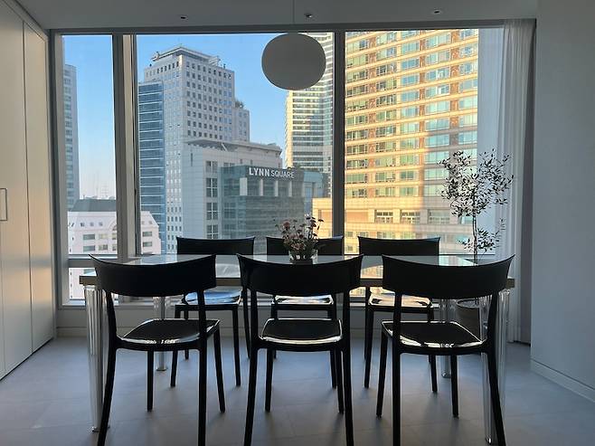 거실에 소파만큼이나 큰 부분을 차지하는 다이닝 겸 작업 테이블 공간이에요. 처음 집을 봤을 때 도시 뷰가 있는 큰 창이 마음에 들어 저 곳은 다이닝 테이블 공간으로 생각해 둔 공간이었어요. 전 세입자는 이 공간을 비워두었는데 너무 아깝더라구요. 그래서 포인트 펜던트로 이 창가 쪽에 시선을 주고 싶어서, 미리 인테리어 업자에게 말을 해 놨던 곳이에요.