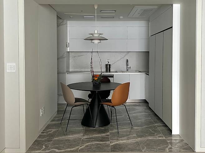 포인트 펜던트로 포인트를 준 모던하고 시크한 주방