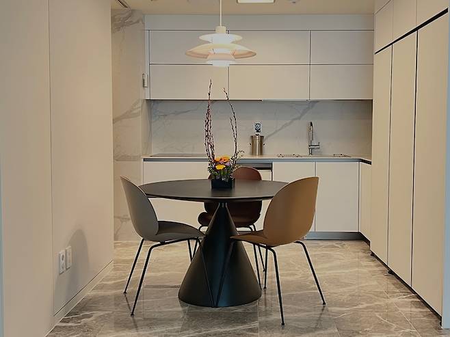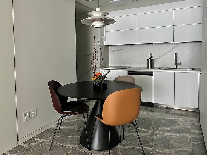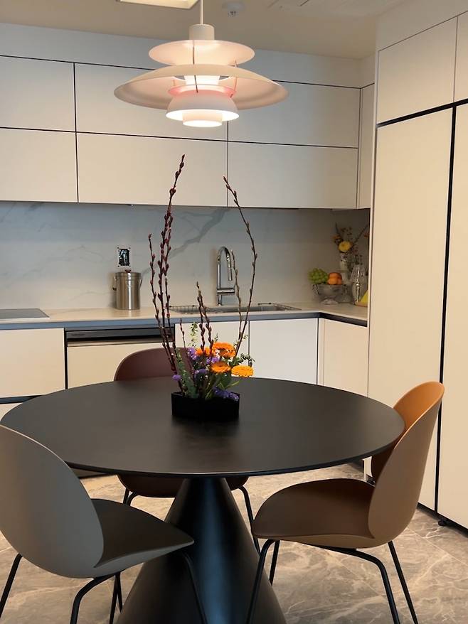 이 공간에서 포인트는 저희 가족이 매일 사용하는 다이닝 가구로 포인트를 주었어요.딱딱한 직사각형 보다는 원형 테이블에 펜던트 조명으로 심플함을 딱 잡아주고 싶었어요. 주방 아일랜드 장도 무광이라 블랙 대리석에 어울리는 매트한 블랙으로 심플한 디자인이지만, 드라마틱한 디테일이 있는 식탁으로 무게를 잡아줬어요.