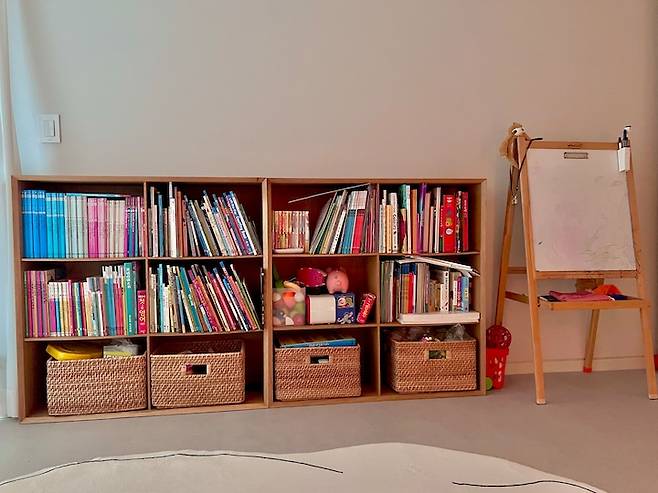 정리하기 어려운 장난감은 밑에 바구니에 넣어 놓았어요. 이 책장은 책장 사이가 얇아 수납도 훨씬 많이 되고 가구 자체도 훨씬 예쁘답니다.