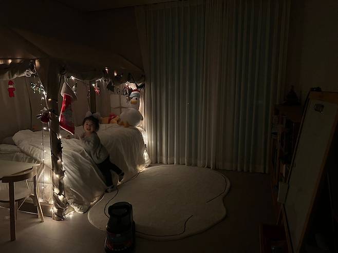 지금은 크리스마스를 맞이해서 아기 침대에 불빛을 켜줬더니 잠자기 전에 불 끄는 거에 거부감이 있었는데 지금은 불 끄는 시간을 기다리고 있어요.