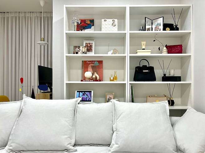 소파 뒤 배경으로는 제가 여행을 갈 때마다 하나씩 모아오거나 좋아하는 오브제, 작업에 쓰는 화병, 아끼는 가방, 해외 박물관에서 산 그림 등 제 취향으로 하나씩 채워나가고 있어요. 이 부분을 차곡차곡 채우는 재미도 있고, 물건들을 바꿔가면서 공간 느낌을 다르게 바꾸는 재미도 있어요. 이걸 핑계로 이것저것 사는 제 핑계 거리가 가득한 공간이에요.
