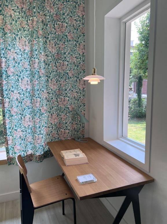 일할 공간인 데스크탑이 들어갈 책상 공간을 생각하면서 저한테 레퍼런스가 되었던 사진이에요. 드로터스라는 가구 편집샵이었는데 창 밖에 햇살과 조명 그리고 책상 딱 이 장면이 잊혀지지가 않더라구요. 정말 유럽의 고흐의 집같은 그런 느낌이 들 정도로 아름다웠었어요. 그래서 거기서 보았던 꼭 소장하고 싶은 펜던트 조명과 위치를 중심으로 베란다 옆 작은 공간에 책상과 조명을 배치하게 되었어요.