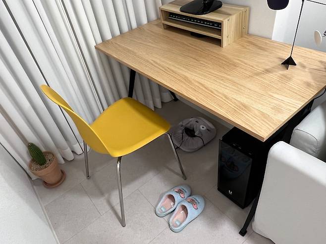 보시다시피 소파로 완벽하게 가려져 게임 불빛이 사방으로 나오는 데스크 탑이 아예 안보이고 테이블 밑에 따뜻한 발 지짐이를 두어도 전혀 안보여서 정말 배치에 만족해 하고 있어요.