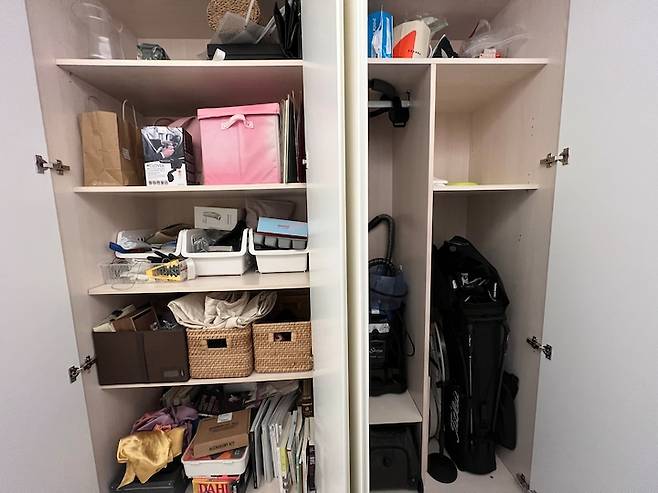 긴 아일랜드 부분은 골프채, 여행 가방, 청소기, 건조기대를 넣고, 왼쪽 큼직한 수납장은 잡다한 물건들이지만 어느 집에나 꼭 있는 물건들이 다 들어가서 문을 닫으면 아주 깔끔해져요. 저희 집이 깔끔함을 유지할 수 있는 비결인 것 같아요.